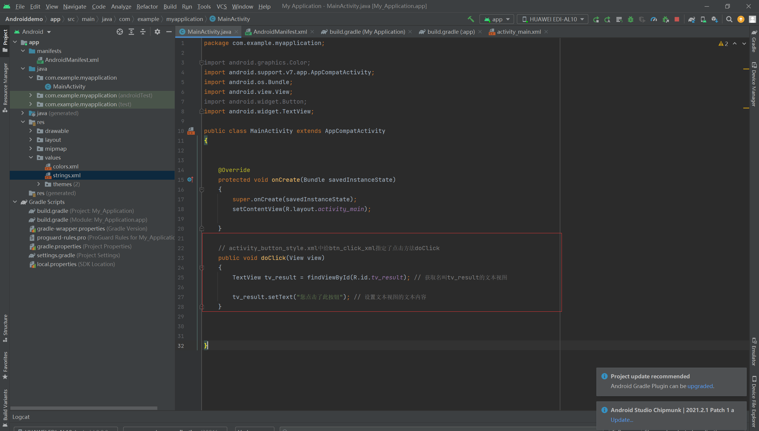 tv_result.setText("您点击了此按钮"); // 设置文本视图的文本内容