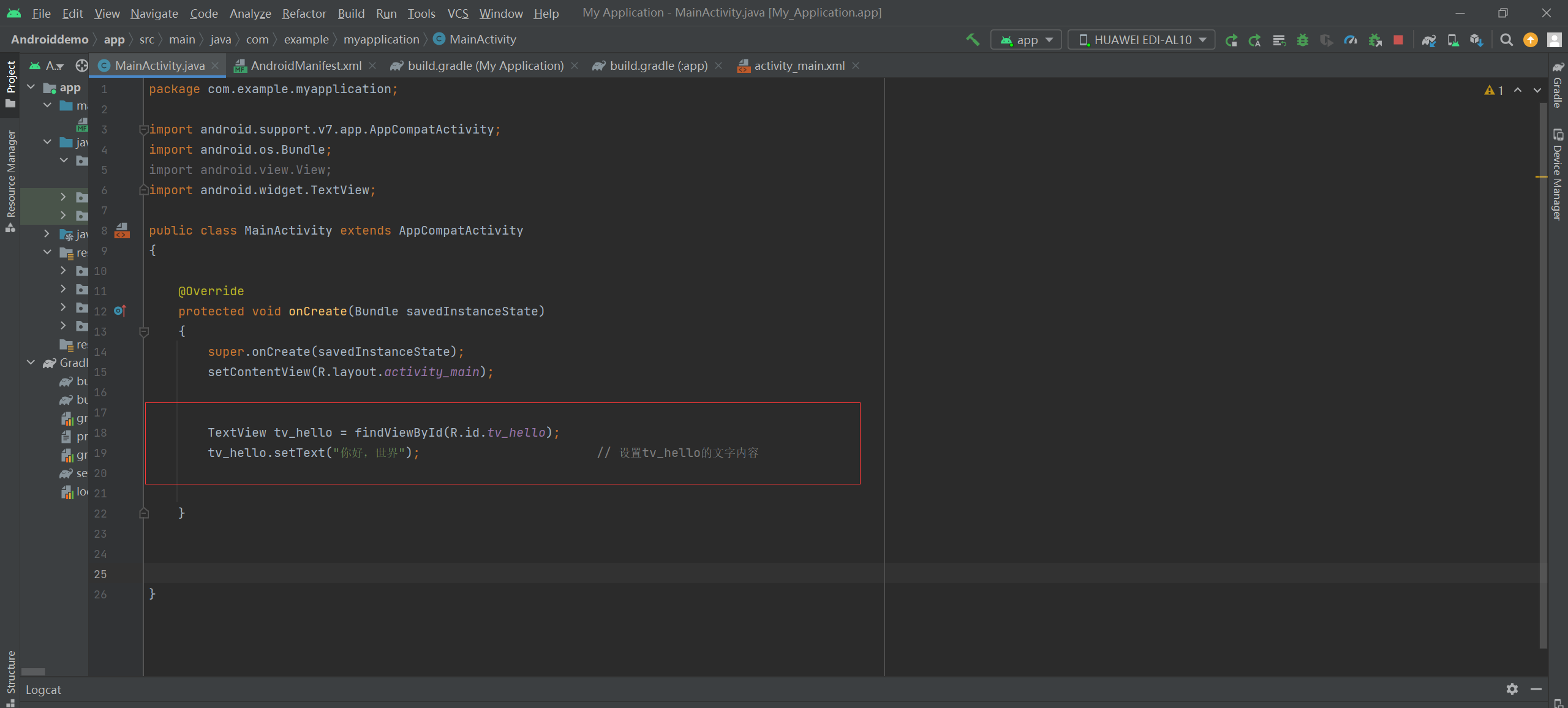 tv_hello.setText("你好,世界"); // 设置tv_hello的文字内容