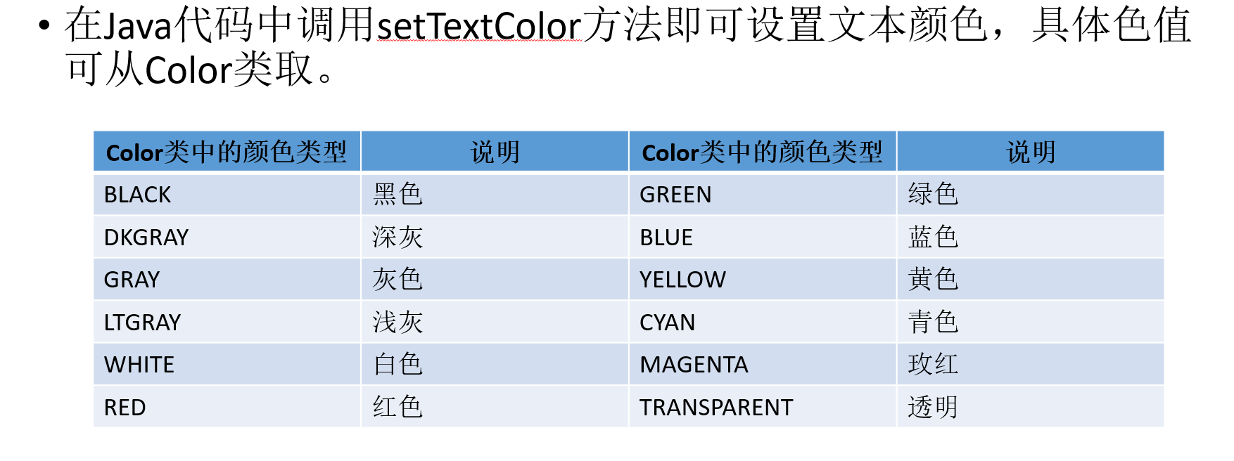 tv_hello.setTextColor(Color.LTGRAY); //设置字体颜色