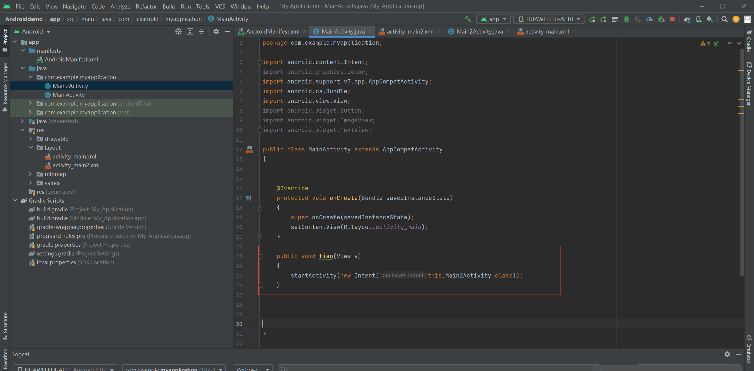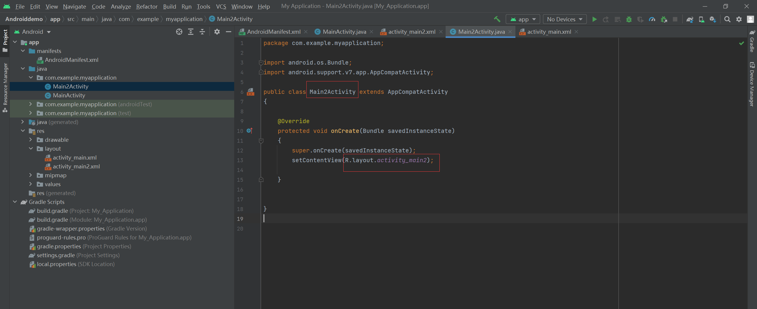 填写如下代码,表示加载来自activity_main2的页面布局:
