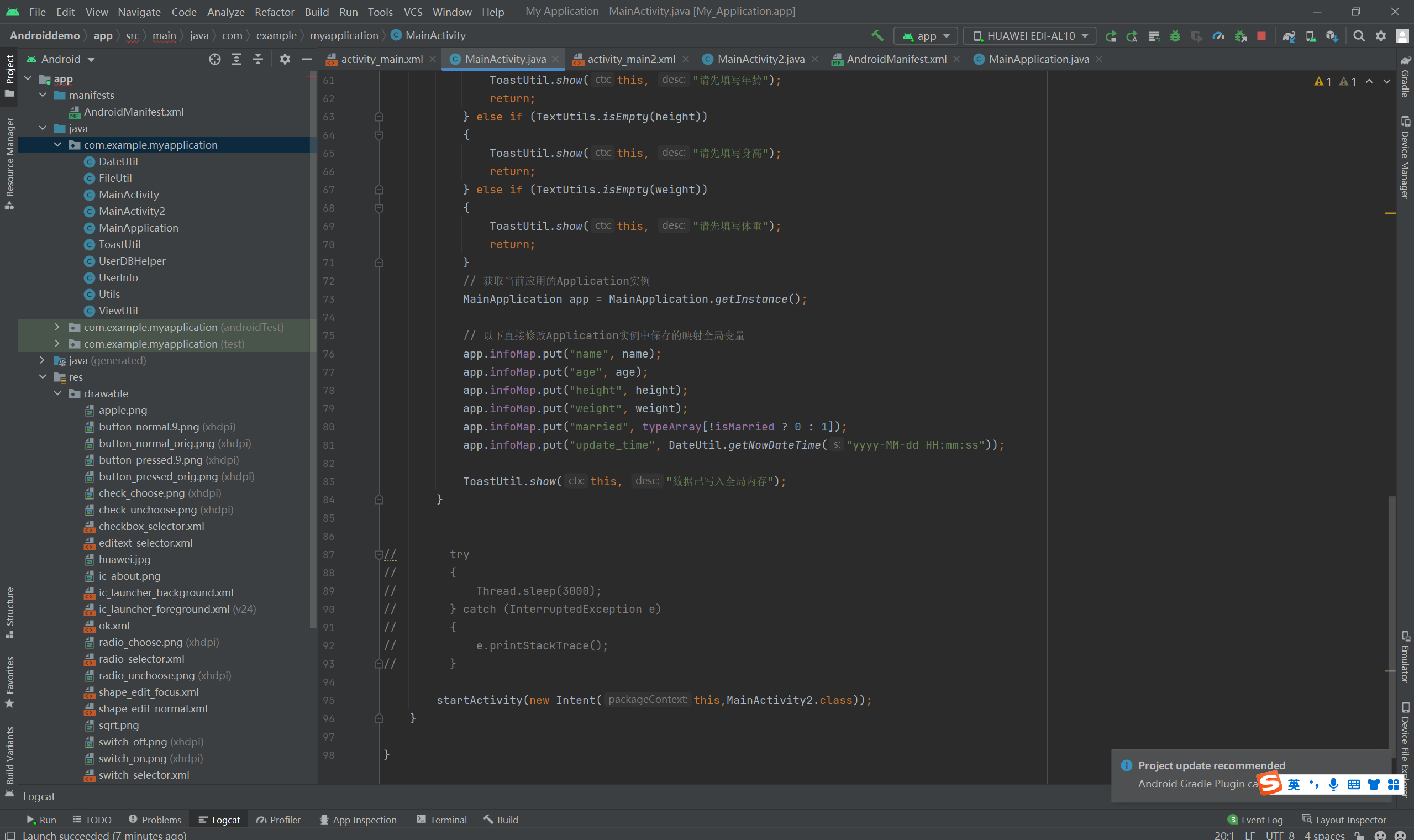 (2)在Activity中调用MainApplication的getInstance方法,获得MainApplication的一个静态对象,通过该对象访问MainApplication的公共变量和公共方法。
