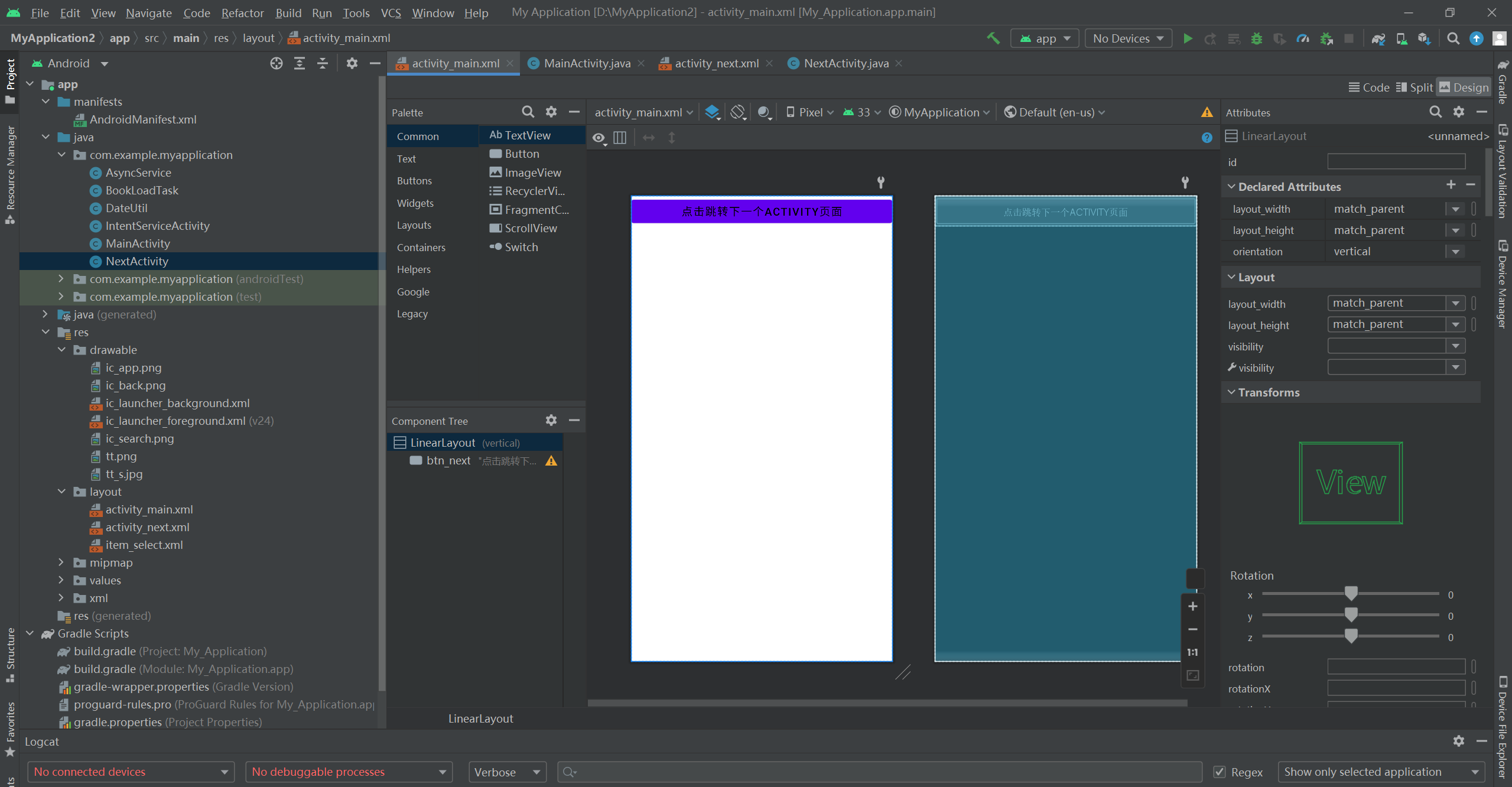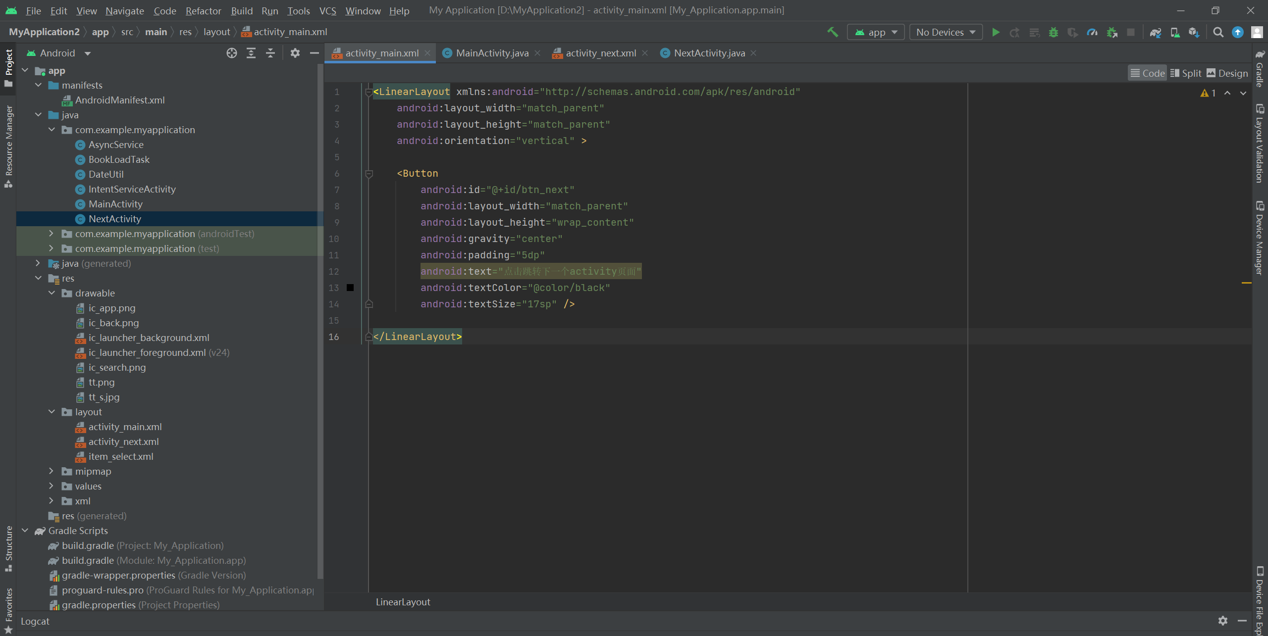 android:text="点击跳转下一个activity页面"
