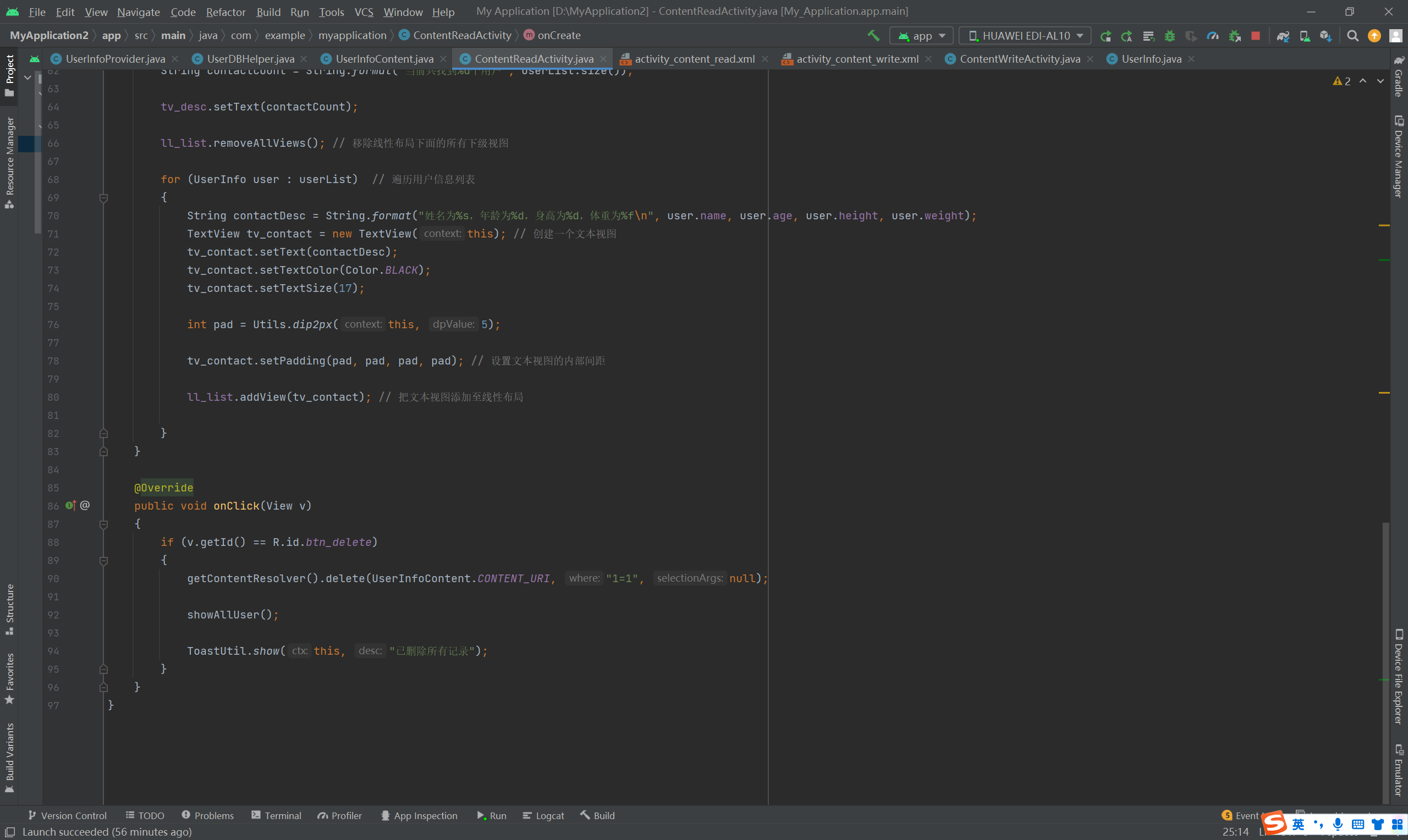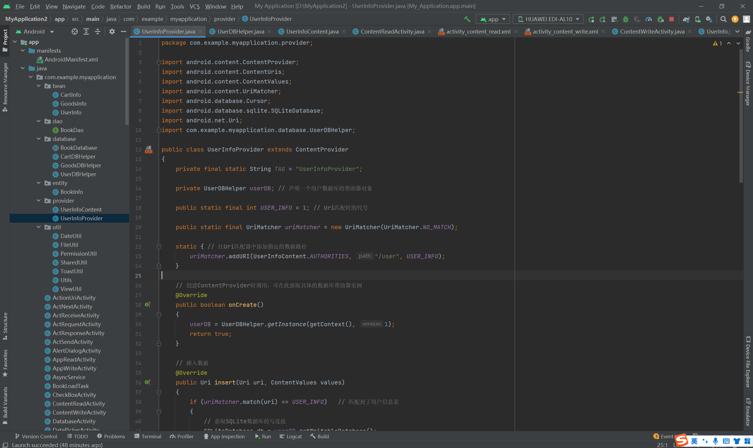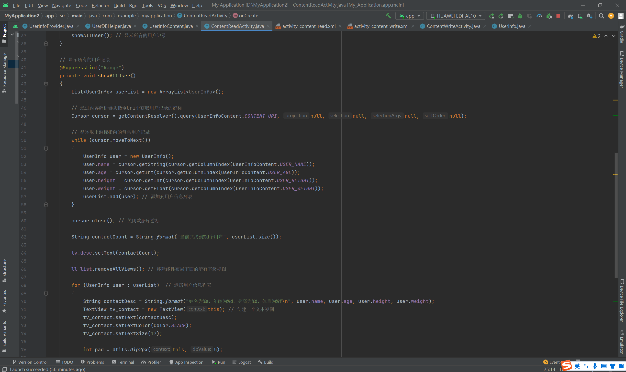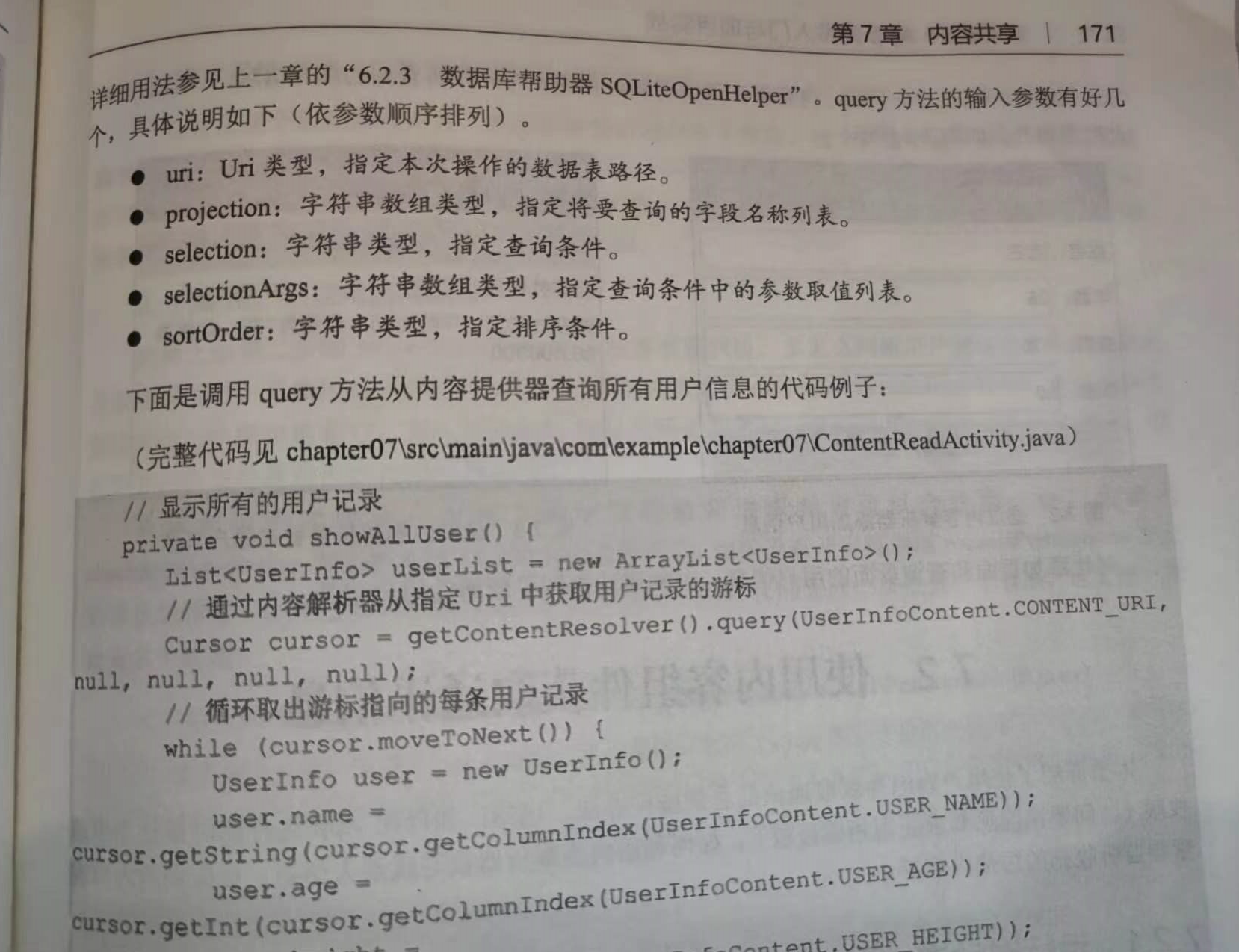 Cursor cursor = getContentResolver().query(UserInfoContent.CONTENT_URI, null, null, null, null);