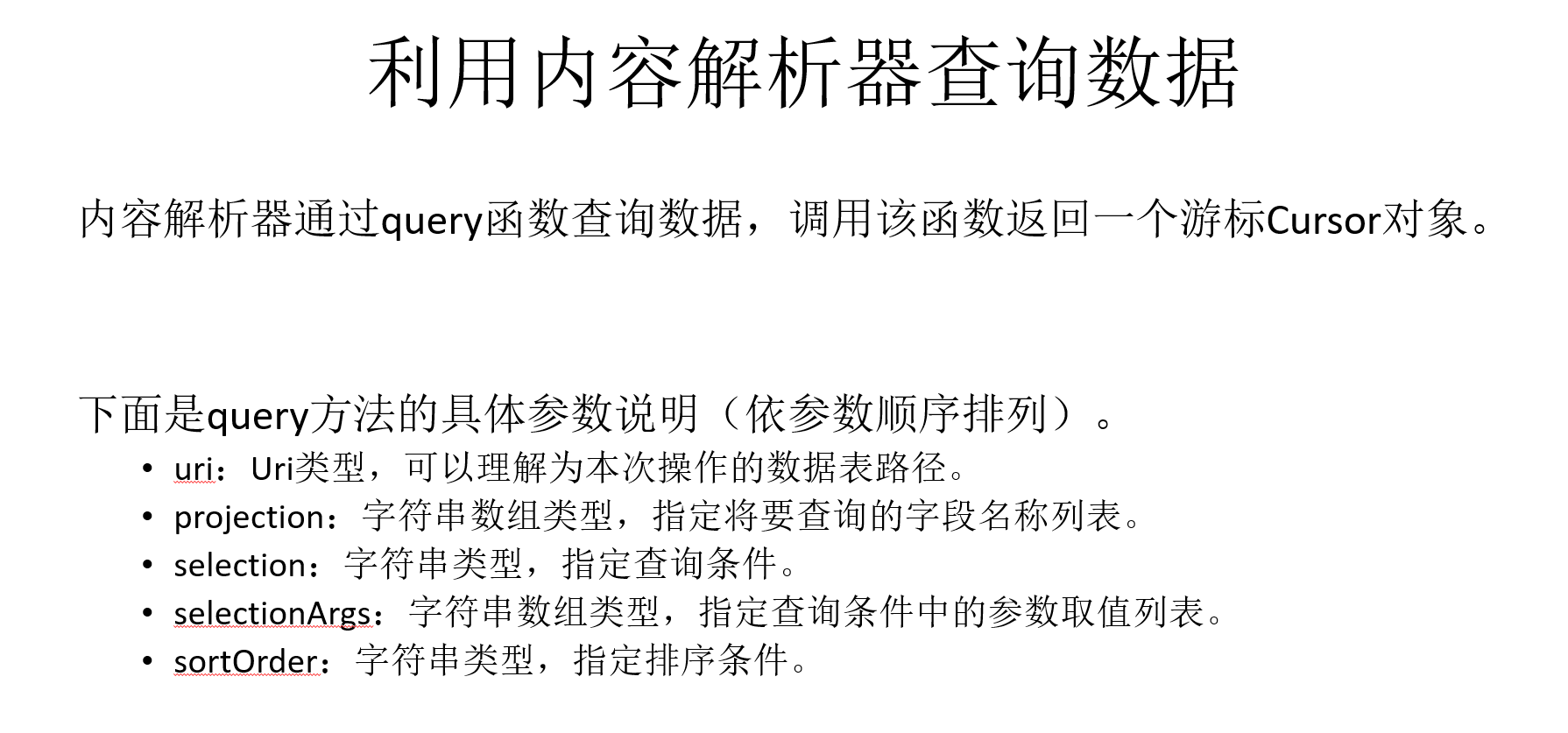 内容解析器是客户端App操作服务端数据的工具,相对应的内容提供器是服务端的数据接口。