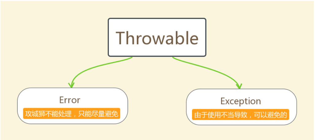 Exception:表示异常,异常产生后程序员可以通过代码的方式纠正,使程序继续运行,是必须要处理的。好比感冒、阑尾炎。
