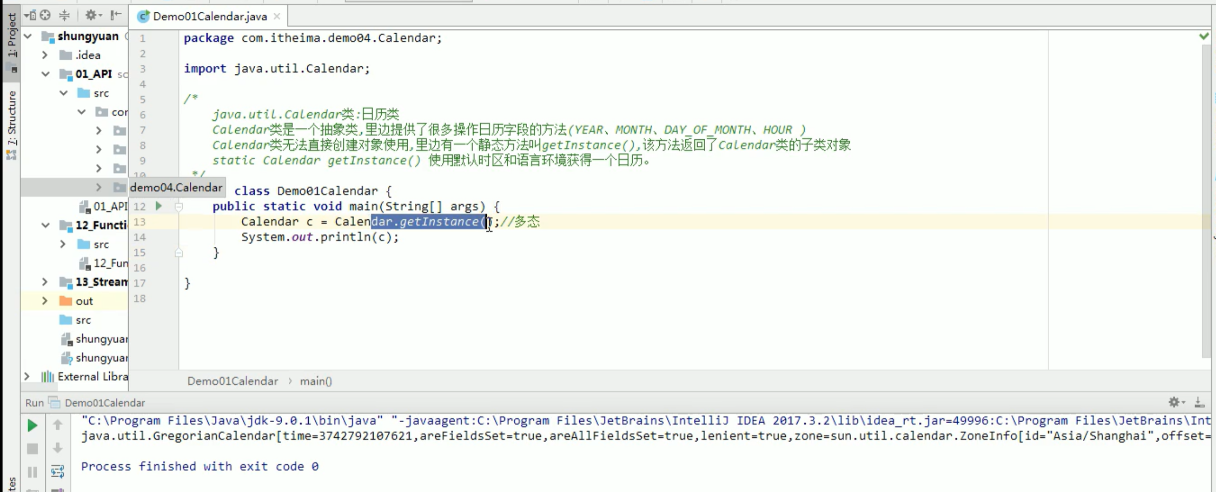 Calendar为抽象类,由于语言敏感性,Calendar类在创建对象时并非直接创建,而是通过静态方法创建,返回子类对象,如下:
