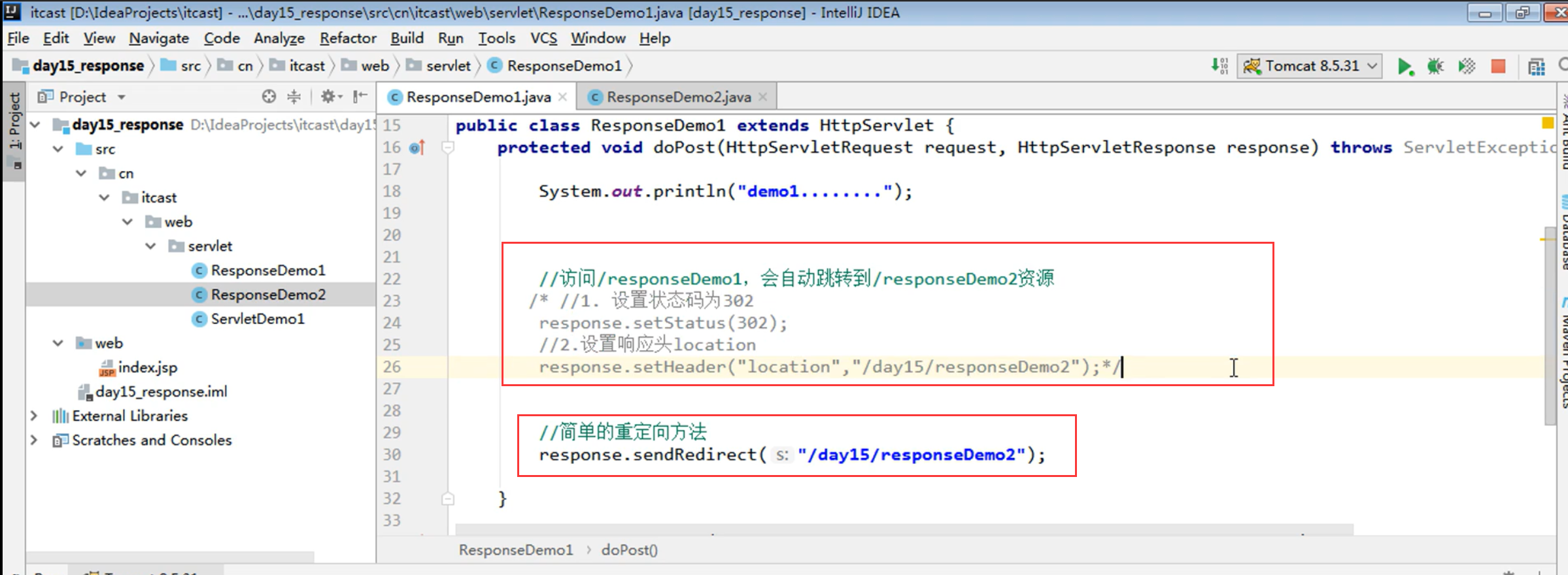 response.setHeader("location","/tes