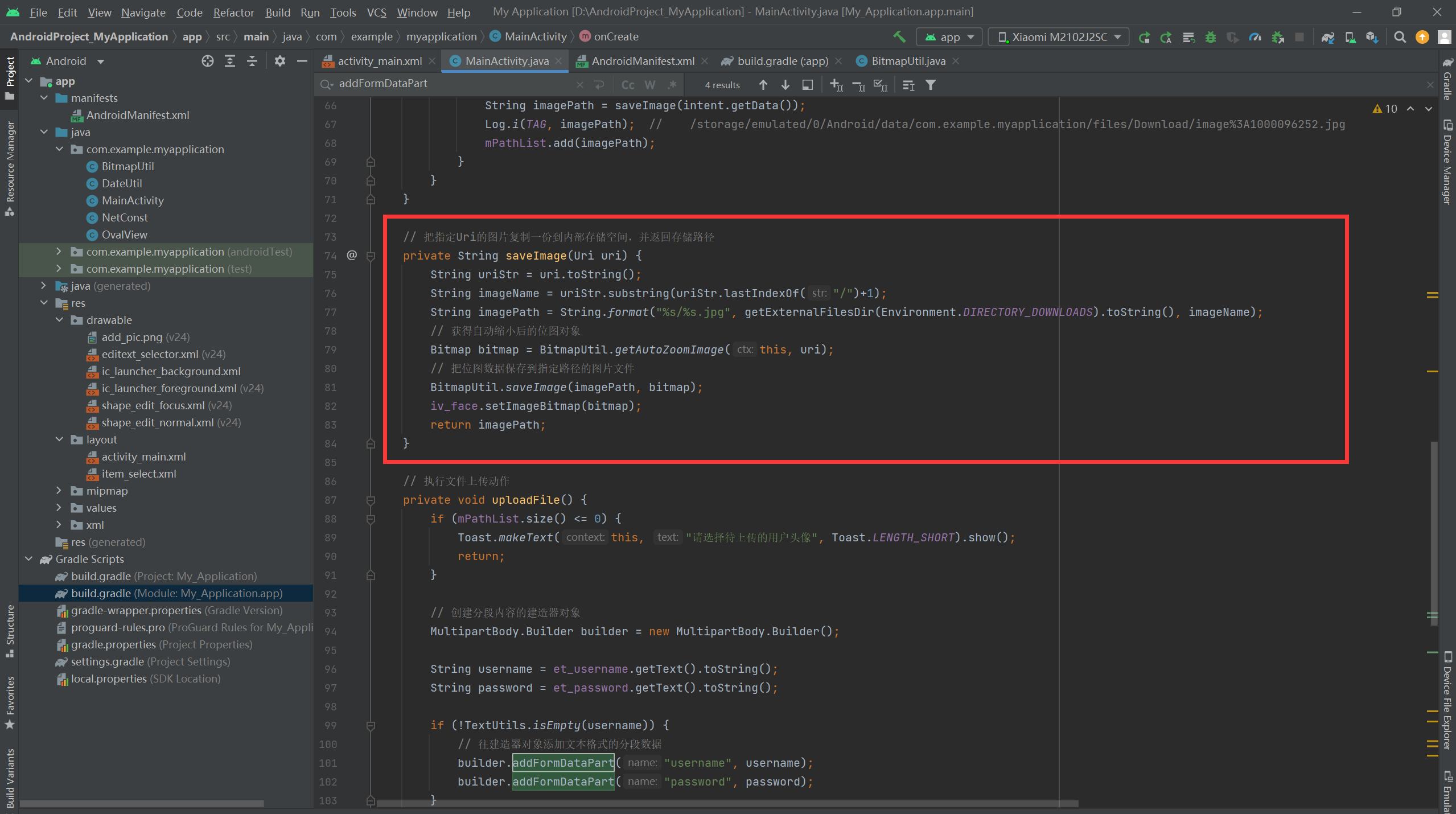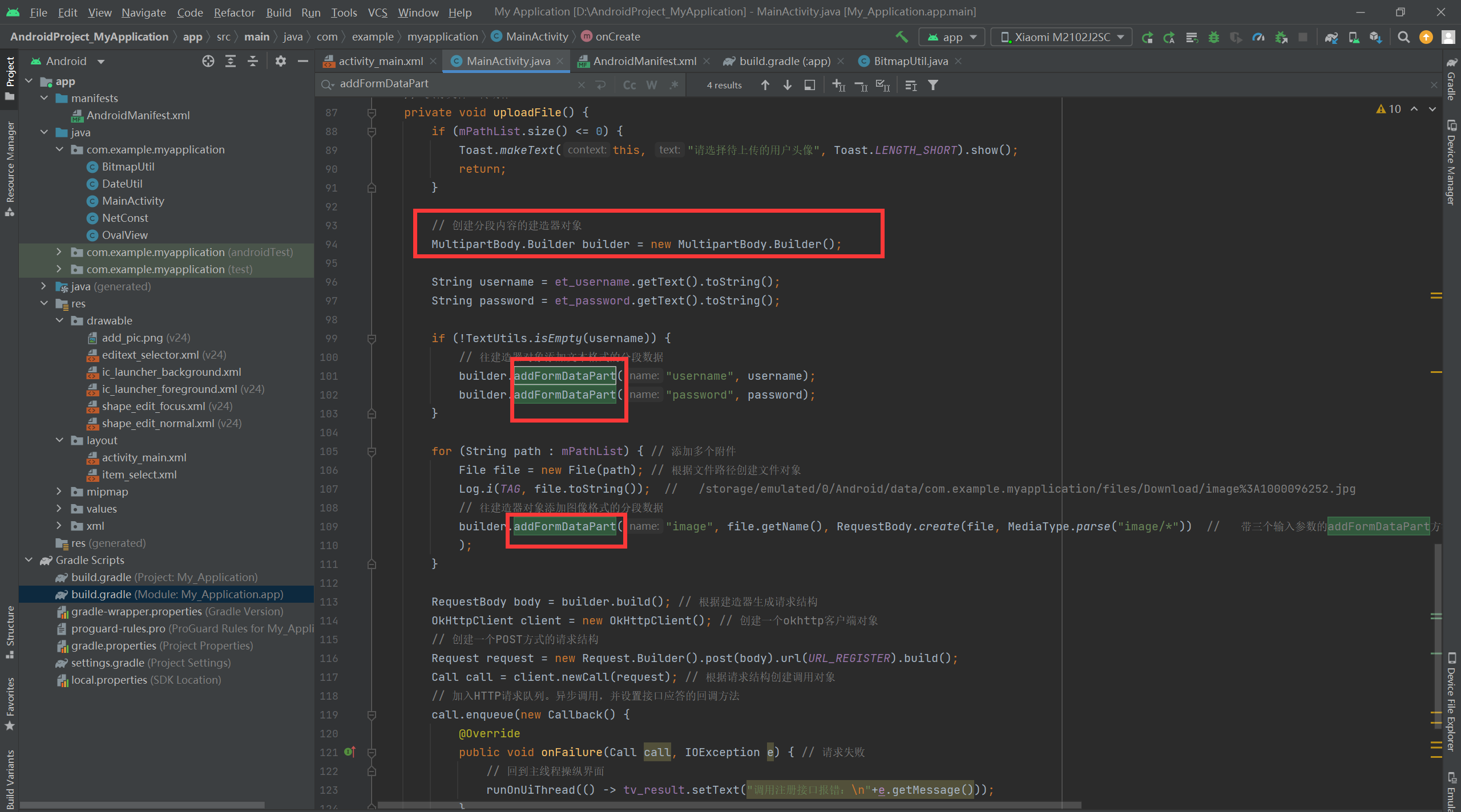 builder.addFormDataPart("image", file.getName(), RequestBody.create(file, MediaType.parse("image/*")) // 带三个输入参数的addFormDataPart方法,它的第一个参数是文件类型,第二个参数是文件名称,第三个参数是文件体,该方法用于传输文件
