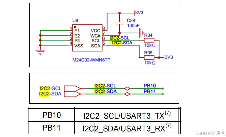 M24C02的SCL及SDA引脚连接到了STM32对应的I2C引脚中,结合上拉电阻,构成了I2C通讯总线,它们通过I2C总线交互。