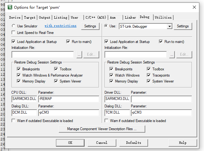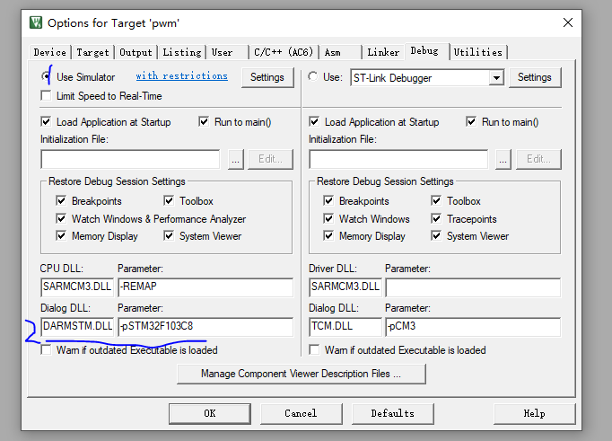 2.点击Use Simulator ,并在Dialog DLL和Parameter中配置使用的芯片信息
