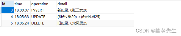 VALUES( NOW(),'DELETE',CONCAT( '旧纪录: ', OLD.id, OLD.name, OLD.gender, OLD.age ));