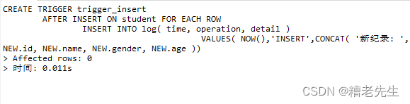 VALUES( NOW(),'INSERT',CONCAT( '新纪录: ', NEW.id, NEW.name, NEW.gender, NEW.age ));