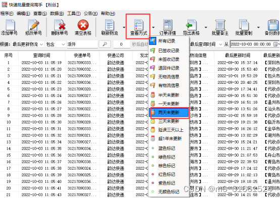 最后,如何筛选出两天未更新物流的单号?点开上方的“查看方式”下的“两天未更新”来分析一下。