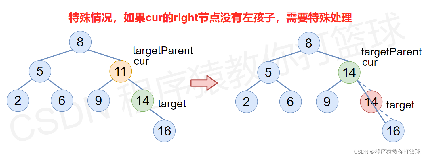 // 即直接将 cur.right 覆盖到 cur 位置, 也就是满足 target == targetParent.right 条件