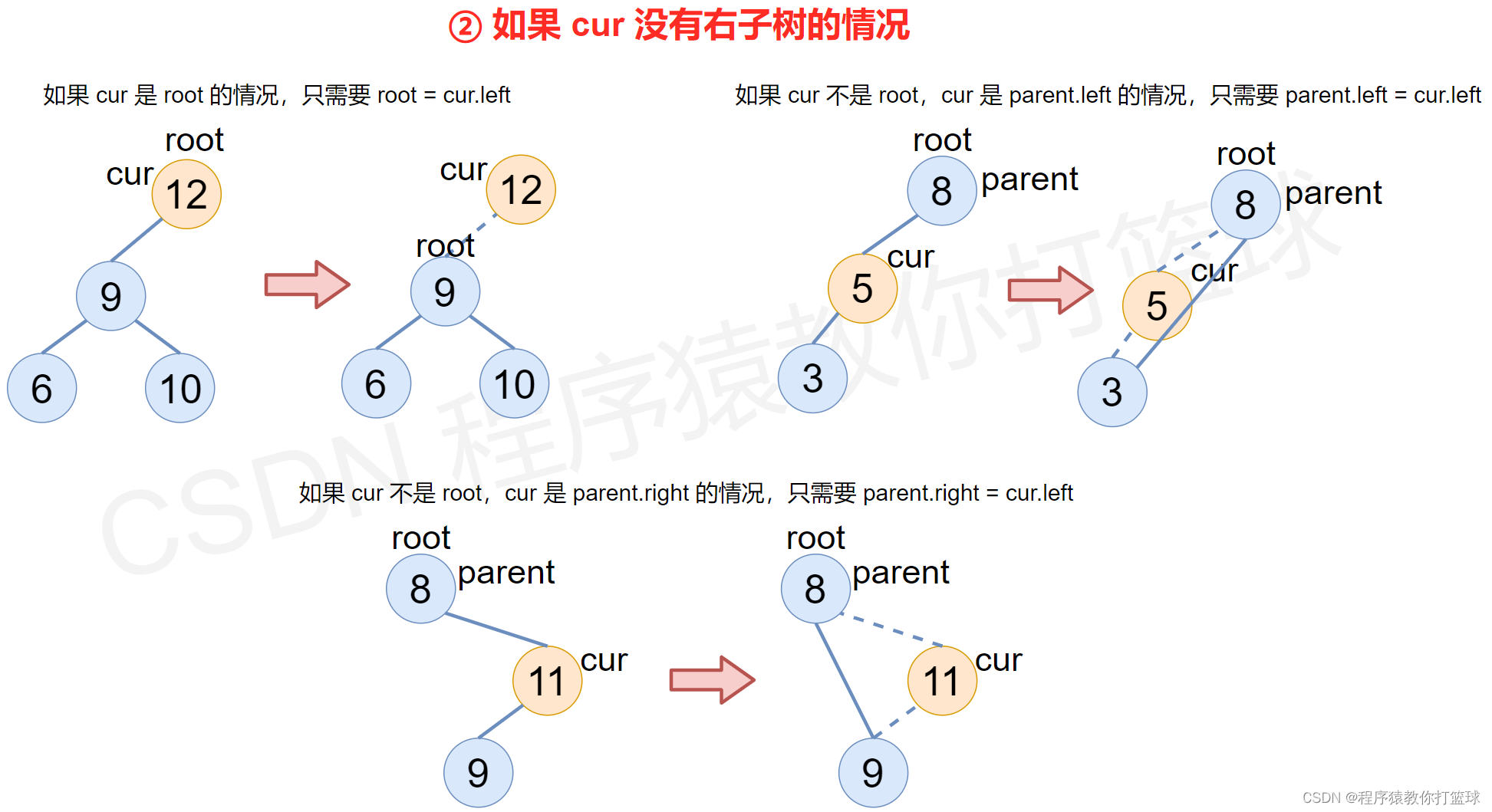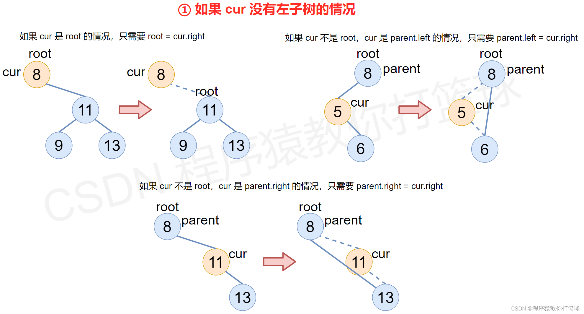 - 如果 cur 不是 root,cur 是 parent.right 的情况,只需要 parent.right = cur.left