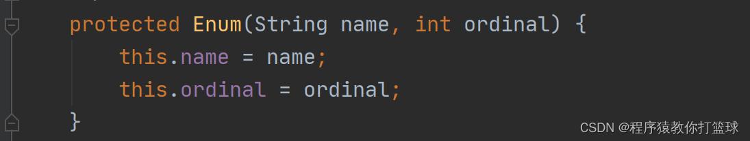 Enum 只有这一个构造方法,还带有两个参数,但是在 JavaSE 的学习中,如果在子类的构造方法中,没有显式写明 super(),则会在子类构造方法第一行默认有 super(),也就是调用父类的无参构造,枚举比较特殊虽然我们写的是两个,但默认他还添加了 name,和 ordinal 参数。也就是说,我们需要提供四个参数: