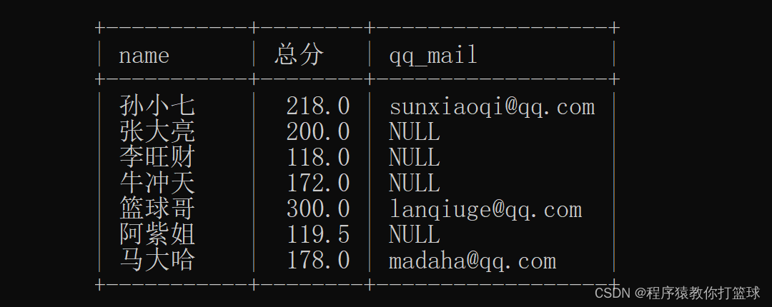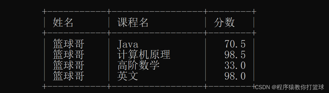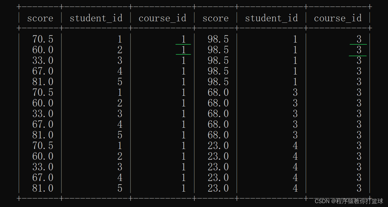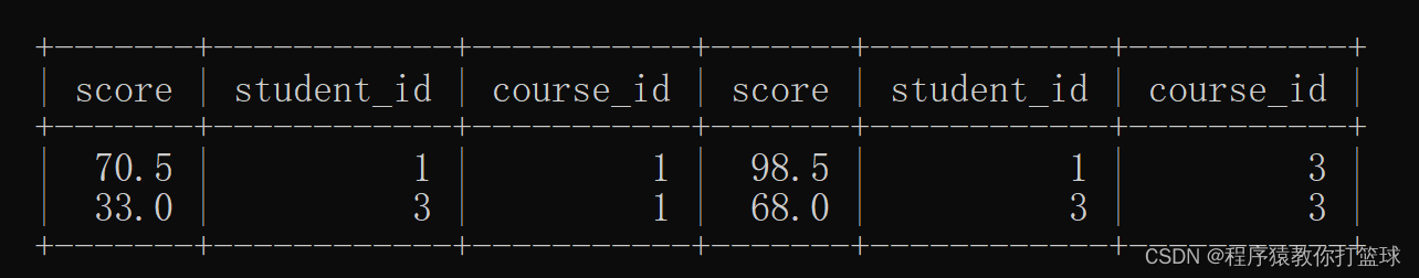 此时要注意篮球哥的信息在 student 表中,而成绩在 score 表里,课程名又在 course 表中,而 score 表中包含了 sutdent_id 以及 course_id: