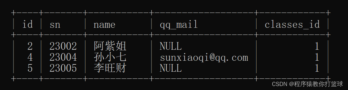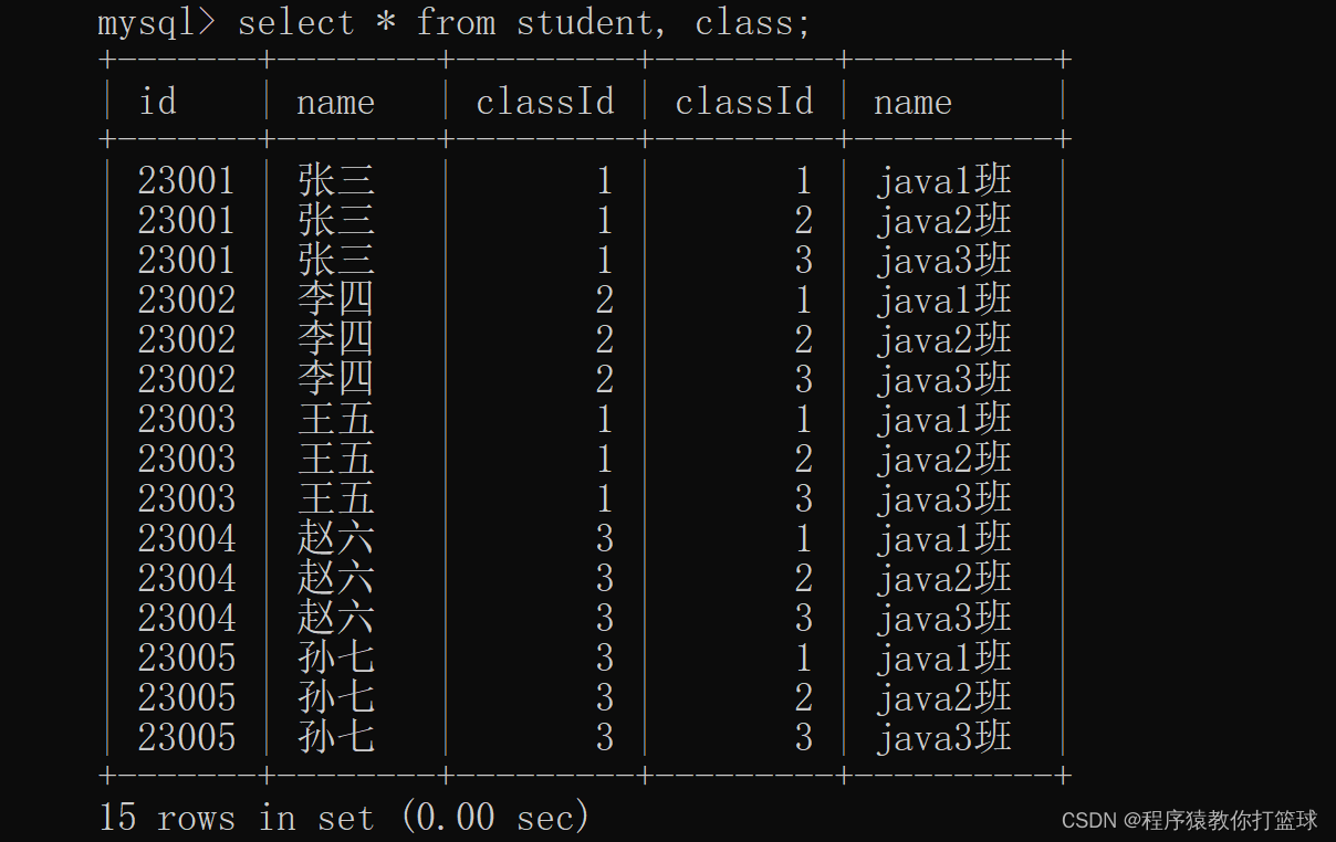 有了上述的数据后,我们就来进行简单的联合查询(通过 student class 表 查询出每个学生对应的班级):