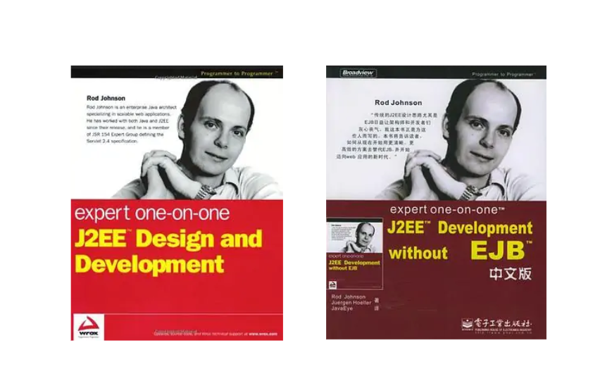Rod Johnson先后编写了两本巨著《Expert One-on-One J2EE Design and Development》、《Expert One-on-One J2EE Development without EJB》,拉起了挑战正统Java EE框架EJB的大旗。