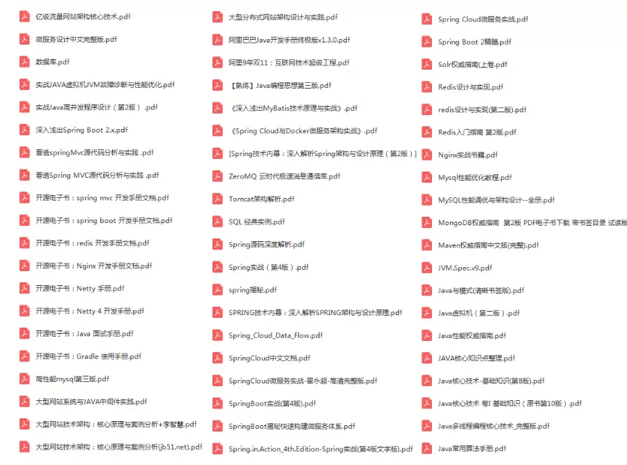 这套题库里面中包含了以下很多个模块:Java 基础、容器、多线程、反射、对象拷贝、Java Web 模块、异常、网络、设计模式、Spring/Spring MVC、Spring Boot/Spring Cloud、Hibernate、Mybatis、RabbitMQ、Kafka、Zookeeper、MySql、Redis、JVM…
