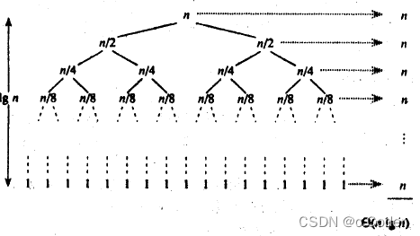 static void _merge_sort(int* arr, int left, int right, int* tmp) { if (left >= right) return; int mid = (left + right) >> 1;//将数组区间一分为二 _merge_sort(arr, left, mid, tmp);//递归进行左区间的分割 _merge_sort(arr, mid + 1, right, tmp);//递归进行右区间的分割 //进行归并 int begin1 = left, end1 = mid;//左区间的起始下标 int begin2 = mid + 1, end2 = right;//右区间的起始下标 int index = left;//临时数组的下标 while (begin1 <= end1 && begin2 <= end2) { //将小的那个值拷贝到临时数组中 if (arr[begin1] < arr[begin2]) tmp[index++] = arr[begin1++]; else tmp[index++] = arr[begin2++]; } //将未归并完毕的数组剩下的值拷贝到临时数组里 while (begin1 <= end1) tmp[index++] = arr[begin1++]; while (begin2 <= end2) tmp[index++] = arr[begin2++]; //将临时数组的值拷贝到原数组中 for (int i = left; i <= right; i++) arr[i] = tmp[i]; } void merge_sort(int* arr, int n) { //临时数组 int* tmp = (int*)malloc(sizeof(int) * n); _merge_sort(arr, 0, n - 1, tmp); free(tmp); }由归并排序的特性可看出,每次都是一分为二的递归,则可以看作一棵完全二叉树进行时间复杂度的计算。