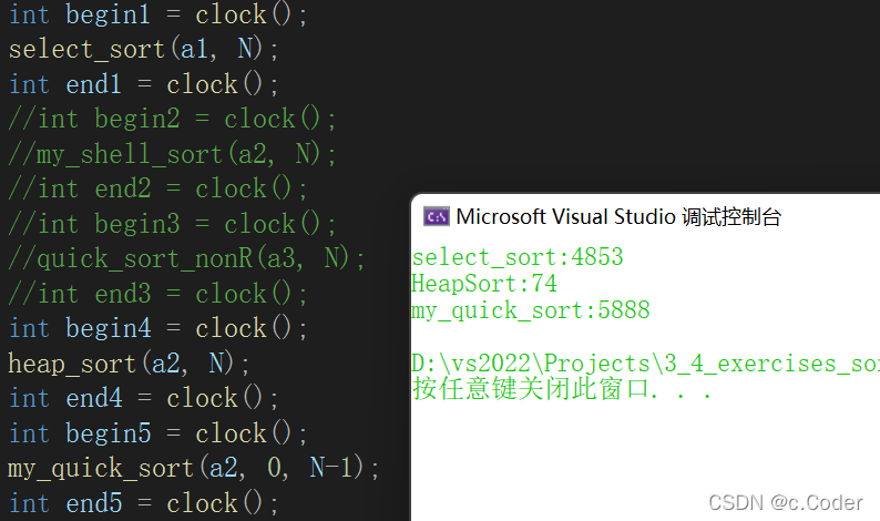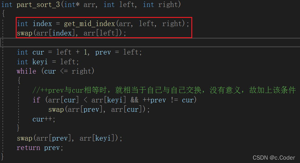 int part_sort_3(int* arr, int left, int right) { //三数取中 int index = get_mid_index(arr, left, right); swap(arr[index], arr[left]); int cur = left + 1, prev = left; int keyi = left; while (cur <= right) { //++prev与cur相等时,就相当于自己与自己交换,没有意义,故加上该条件 if (arr[cur] < arr[keyi] && ++prev != cur) swap(arr[prev], arr[cur]); cur++; } swap(arr[prev], arr[keyi]); return prev; } void my_quick_sort(int* arr, int left, int right) { //当区间不存在时,即不需要再继续进行递归 if (left > right) return; int keyIndex = part_sort_3(arr, left, right); //进行小区间优化 if (keyIndex - 1 - left > 13) my_quick_sort(arr, left, keyIndex - 1);//递归左区间 else//到一定小的范围则改用插入排序 insert_sort(arr + left, keyIndex - 1 - left + 1); if (right - (keyIndex + 1) > 13) my_quick_sort(arr, keyIndex + 1, right);//递归右区间 else insert_sort(arr + keyIndex + 1, right - (keyIndex + 1) + 1); }