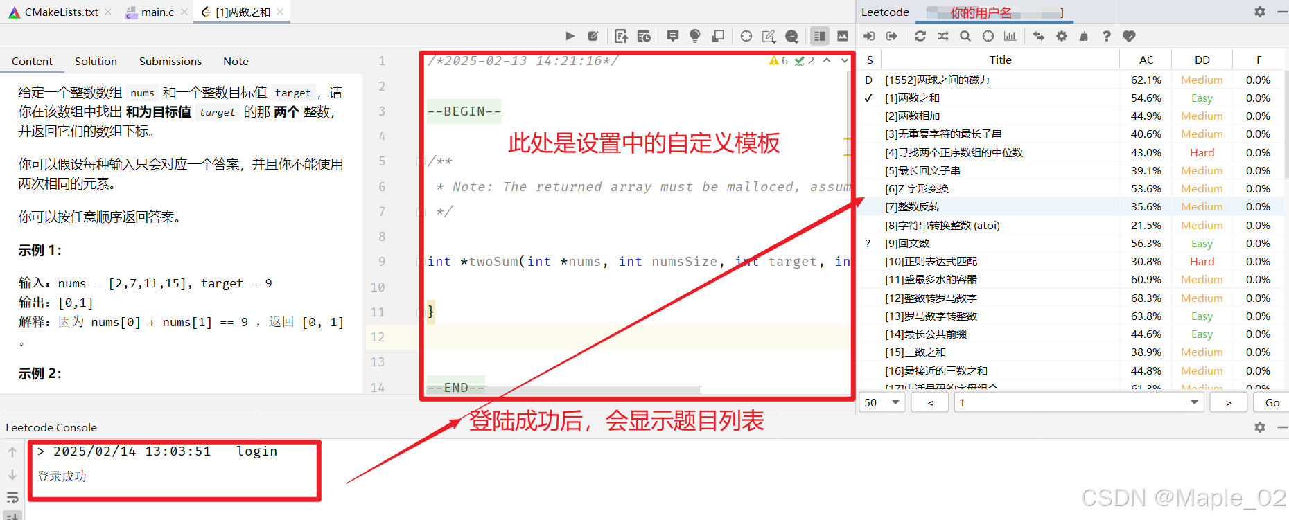 到这里就全部设置完成了,可以正常使用插件来刷题,在Clion上提交的题目也是会同步到leetcode账号上的,非常的方便
