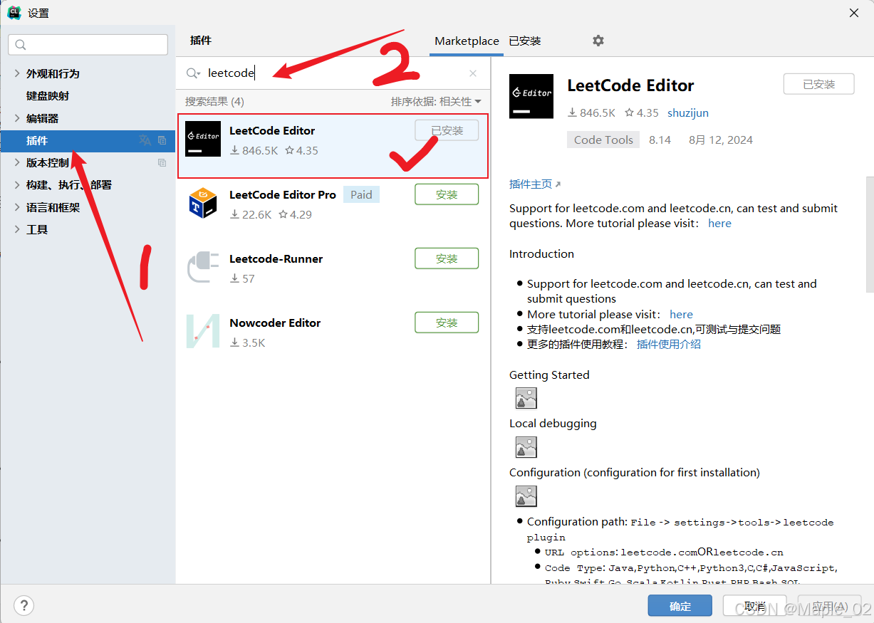 打开设置后找到- 插件(plugs),在搜索框中搜索“leetcode”就可以;安装第一个(安装后可以重启一下clion)