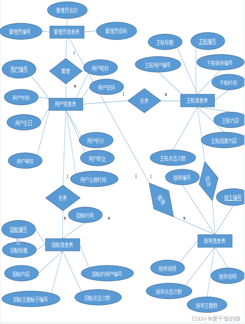 - 主贴信息表(主贴编号,主贴板块编号,主贴用户编号,主贴回复次数,主贴标题,主贴内容,主贴时间,主贴回复次数,主贴点击次数)