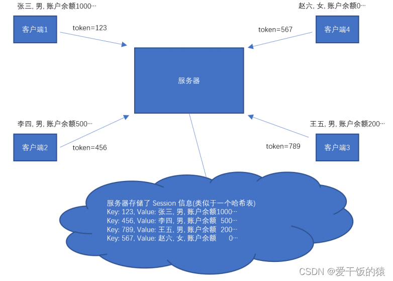 服务器在同一时间可能会收到许多请求,服务器要区分清楚每个请求的用户是谁,就需要在服务器记录每个用户的令牌和用户信息。