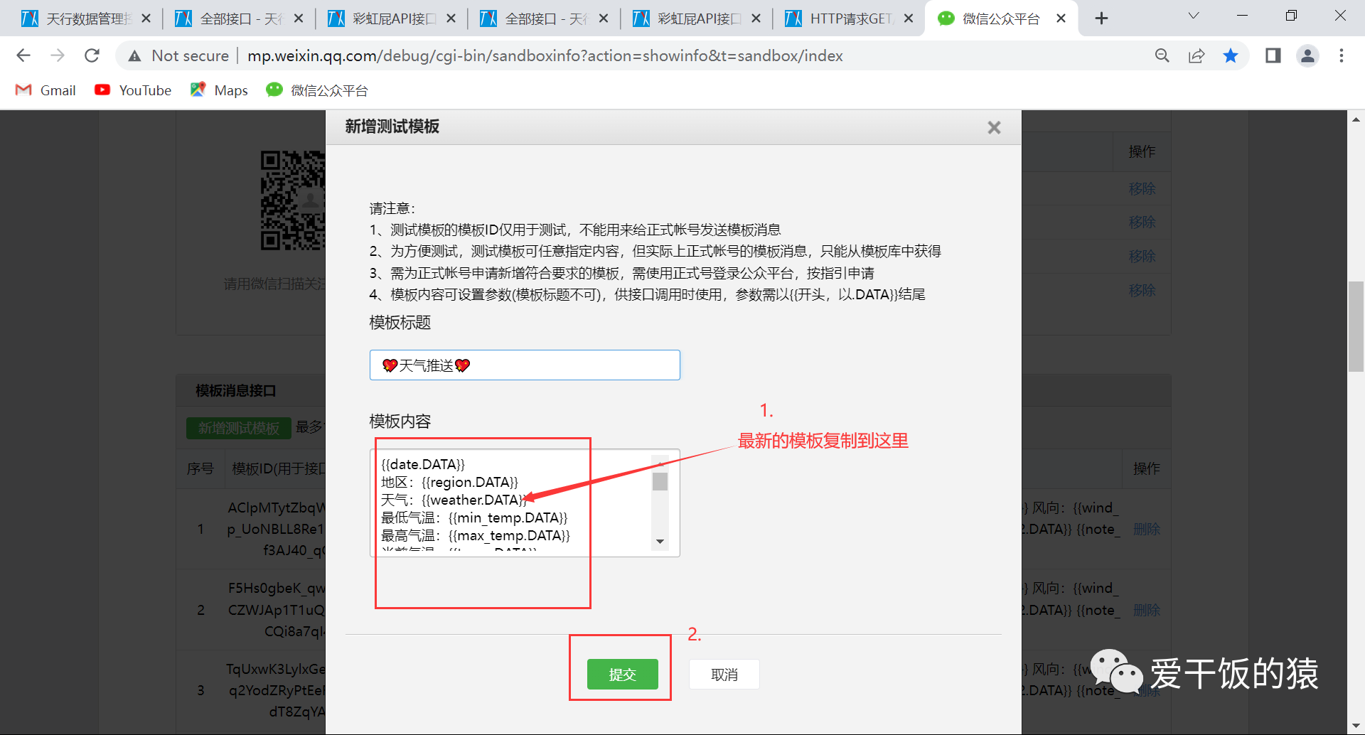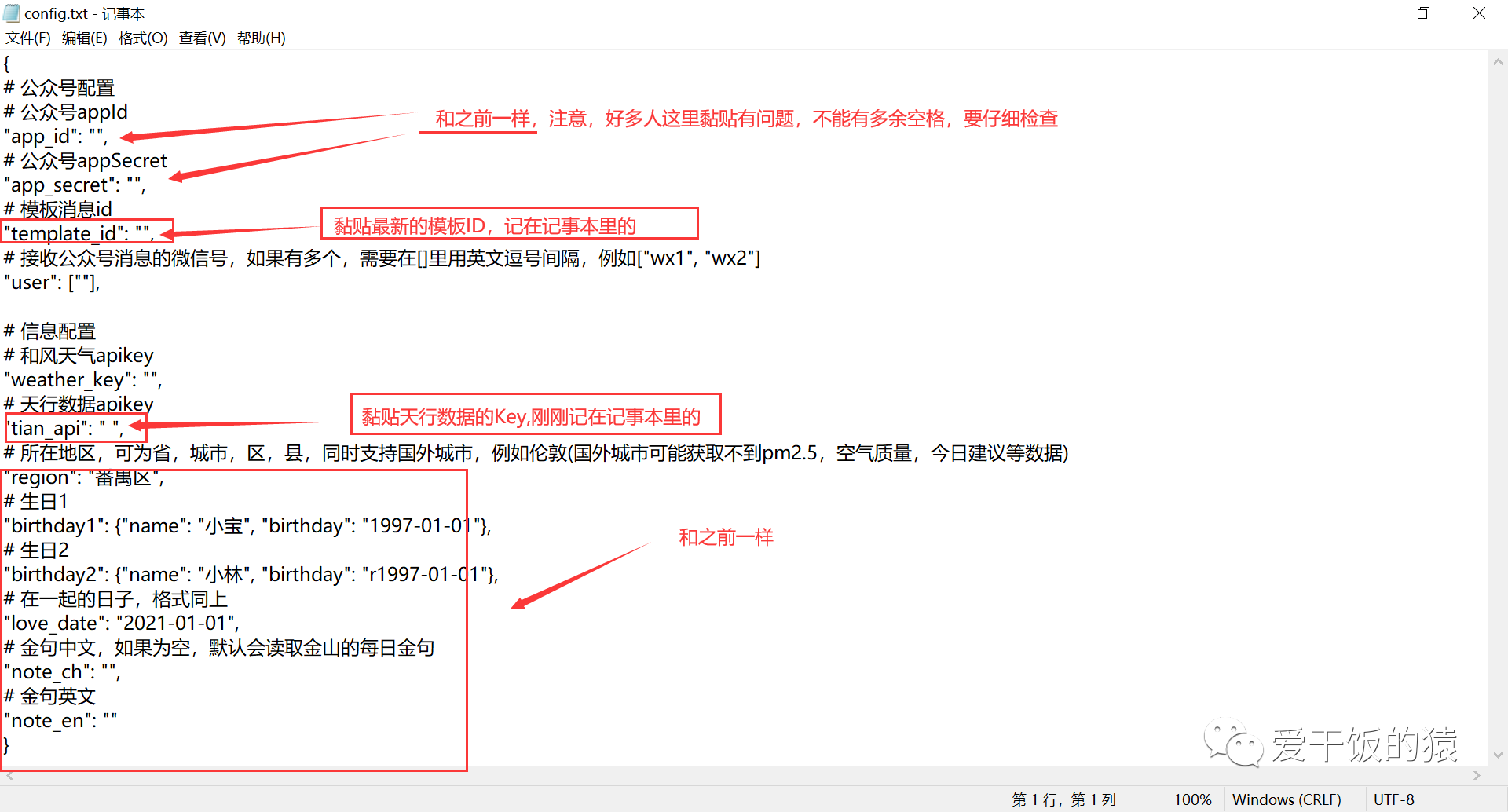 修改内容(如有不懂请看公众号第一篇文章:《手把手教小白制作情侣天气推送号 【只需五步】》)