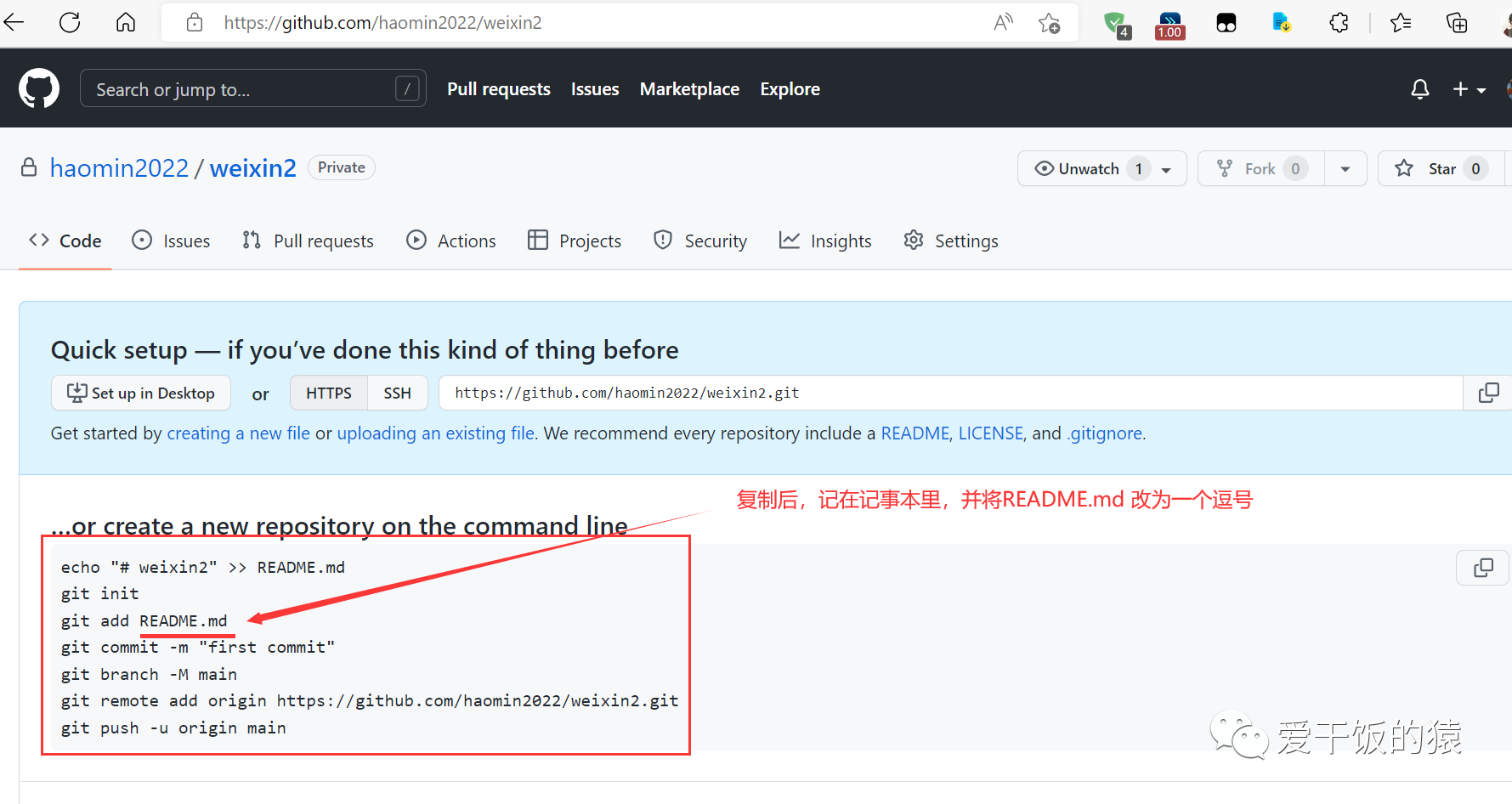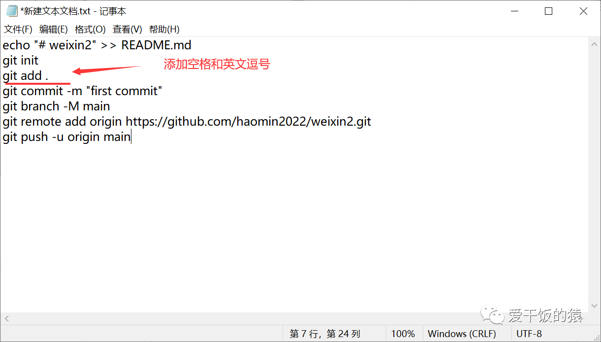 复制框出代码到一个记事本里,并删除README.md字母,在添加空格和一个英文" ," 号变成git add .