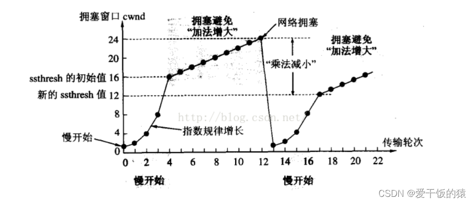 1. 慢开始 + 快增长,慢开始,一开始 cwud 很小 cwnd = 1,在增长阶段,成指数增长cwnd = cwnd * 2,到达一个阈值(yu)后,一次 cwnd + 2