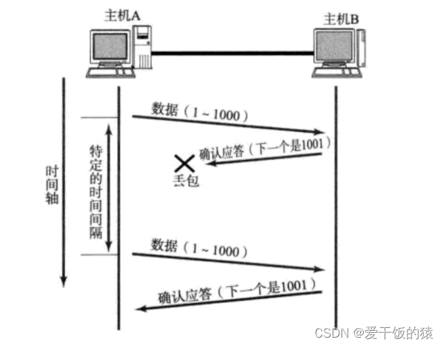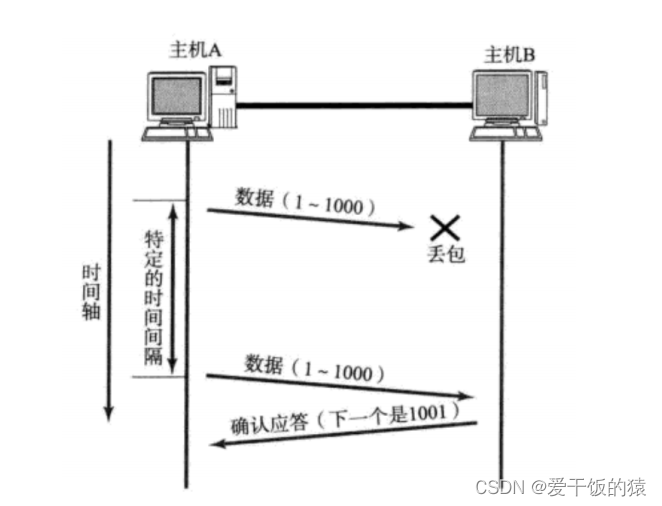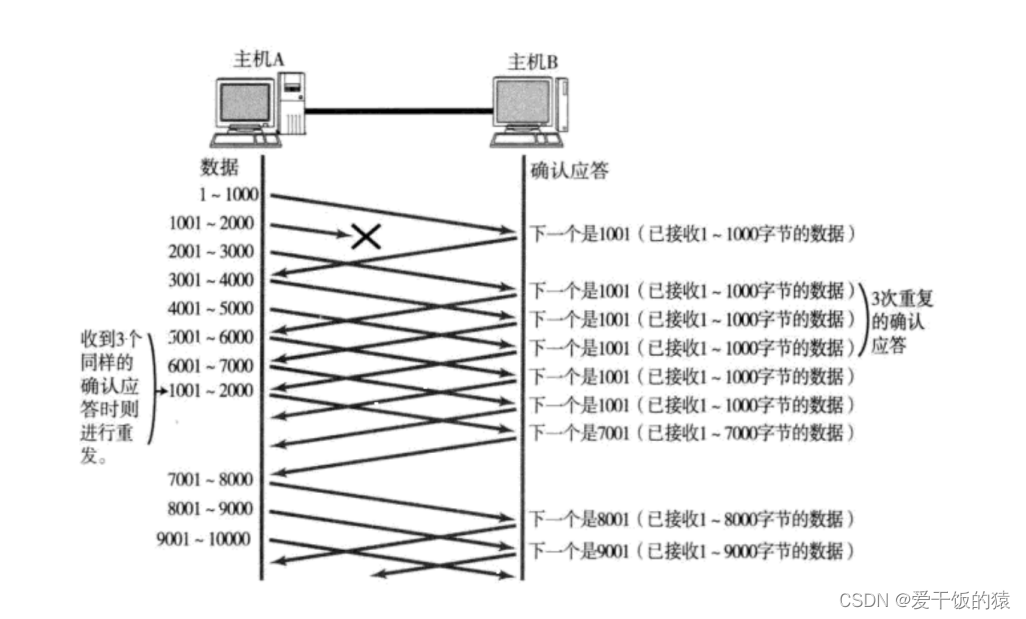 如果发送端主机连续三次收到了同样一个 "1001" 这样的应答,就会将对应的数据 1001 - 2000 重新发送;