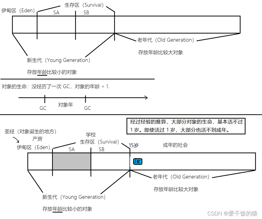 4.当我们的对象,14岁时,再遇到了GC,则变成15岁,视为成年,如果还或者,则从生存区,移动到老年代。新生代的过程就和我们没关系了。