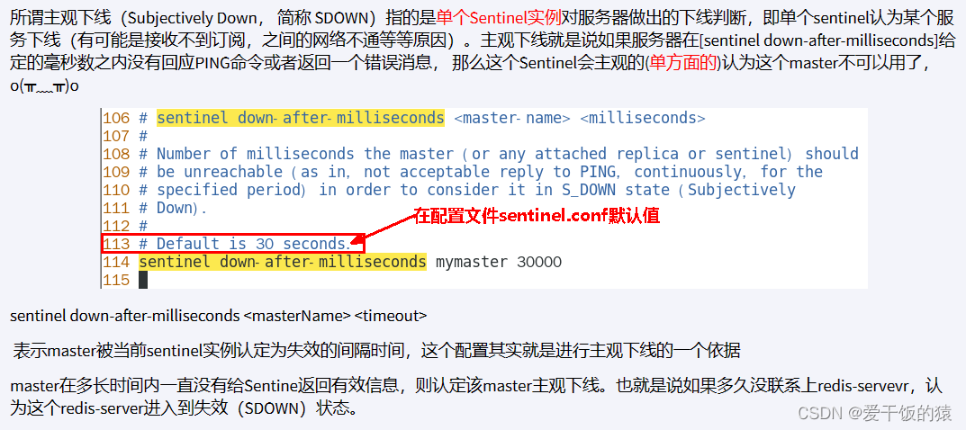 - sentinel配置文件中的down-after-milliseconds 设置了判断主观下线的时间长度