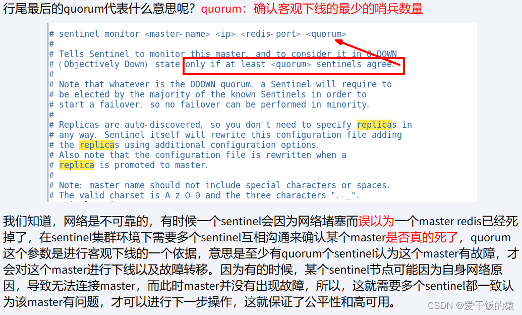 - quorm 表示最少有几个哨兵认可客观下线,同意故障迁移的法定票数