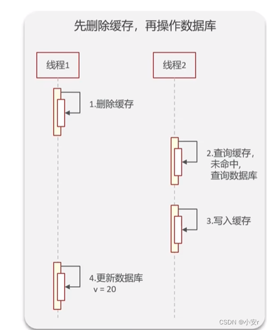 线程一删除缓存——>线程二查询缓存未命中查询数据库——>线程二将查询结果写入缓存,此时线程二运行结束——>此时线程一进行更新数据库