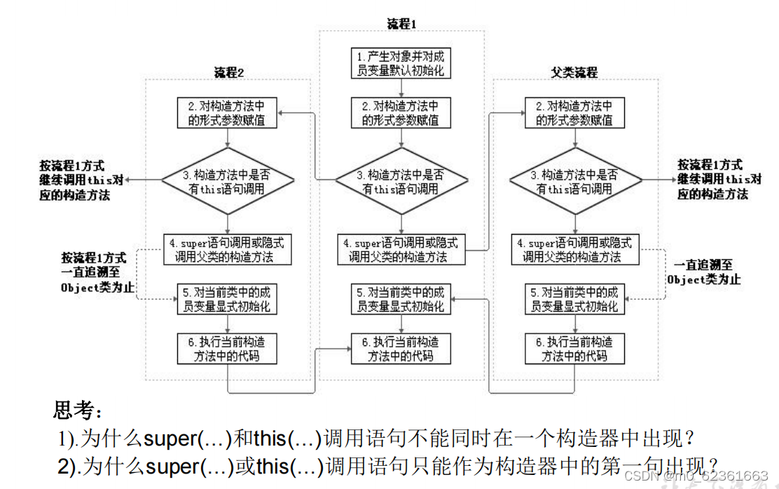 当父类中没有空参数的构造器时,子类的构造器必须通过this(参数列表)或者super(参数列表)语句指定调用本类或者父类中相应的构造器。同时,只能”二选一”,且必须放在构造器的首行