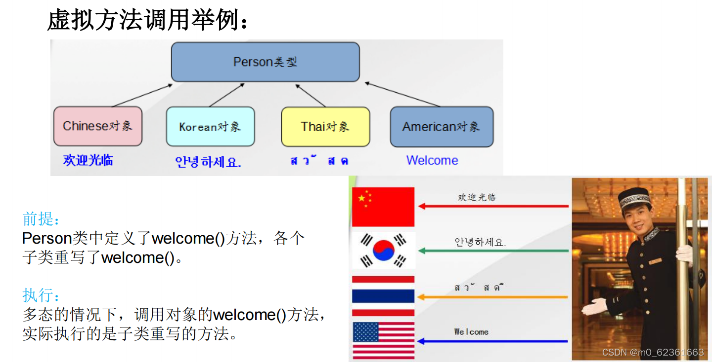 子类中定义了与父类同名同参数的方法(重写父类方法),在多态情况下,将此时父类的方法称为虚拟方法,父类根据赋给它的不同子类对象,动态调用属于子类的该方法。这样的方法调用在编译期是无法确定的。