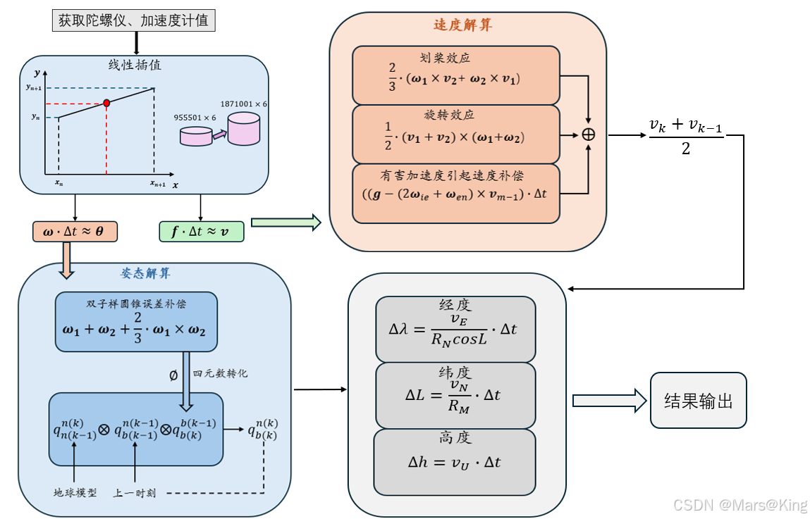 该部分可以理解为一个“黑盒”,输入是角增量与比力增量,输出是载体的姿态角、速度、位置。具体内容见后面文章慢慢分享。