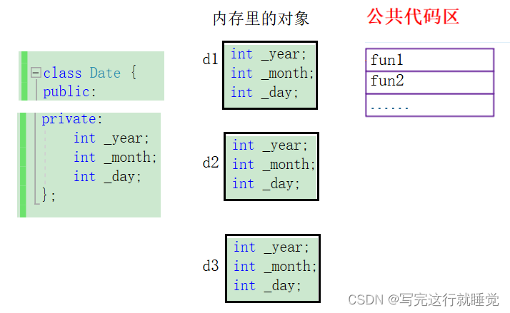 实例化出来的对象里只保存成员变量,类里面的成员函数存放在公共的代码段。