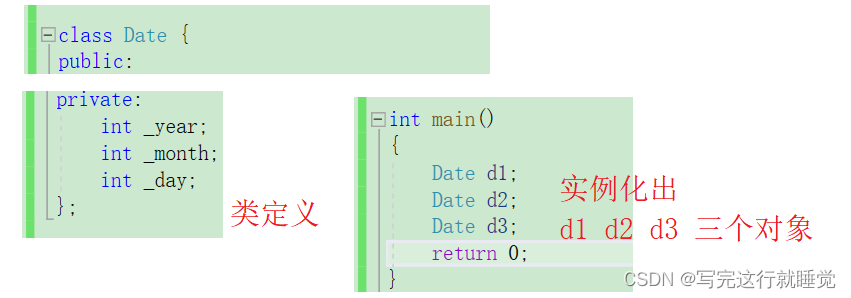 2. 一个类可以实例化出多个对象,实例化出的对象 占用实际的物理空间,存储类成员变量。类名是没有空间的,只有类实例化出的对象才有具体的成员。使用类名去访问成员是错误的。