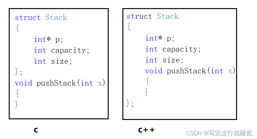 C语言结构体中只能定义变量,在C++中,结构体内不仅可以定义变量,也可以定义函数。用C语言方式实现的栈,结构体中只能定义变量;如果以C++方式实现栈,struct中可以直接定义函数,更加方便。