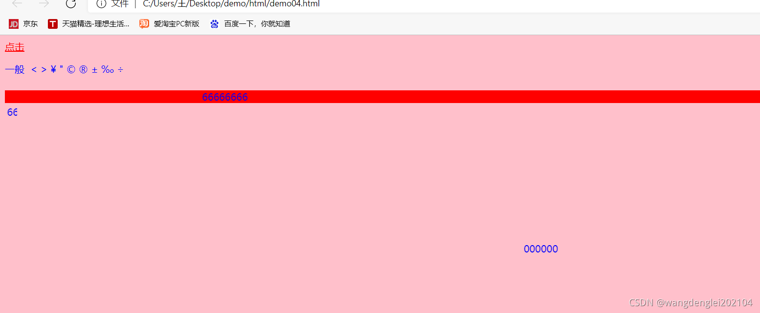 <body text="blue" link="green" alink="pink" vlink="red" bacolor="blue" bgcolor="pink"><a href="https://www.baidu.com/" target="_blank">点击</a>