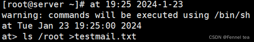 二 、指定在2024/1/23 19:25 将时间写入testmail.txt文件中使用at 命令: