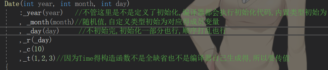 - 构造函数{...}里的叫赋值,不是初始化,初始话格式:例如Date (int year,int month,int day):_year(year),_month(month),_day(day){...}这个是在没进入构造函数之前完成的,(初始化格式如果不写,编译器自己会加上)