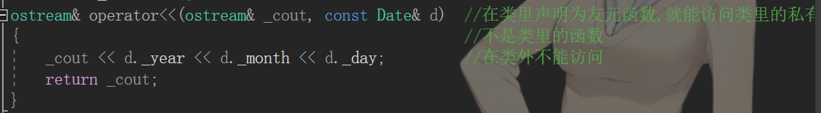 - 不是类里的函数,不能在类外访问类里的私有的成员变量,所以有了友元函数,在类里把这个函数声明一下就行了