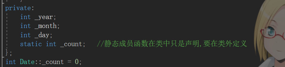 - 静态成员变量的建立,注意:定义要加上作用域限定.在类外初始化..因为_count还是私有的所有要建立一个静态成员函数用来获取_count的值