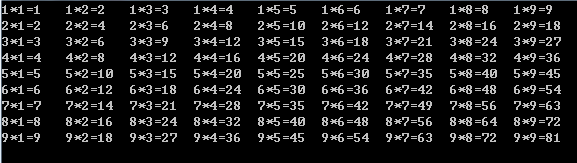 尝试使用Java中的printf函数,让每个式子按“a*b=c”的形式输出,其中a和b各占1位列宽,c占4位列宽并左对齐。最终输出效果如下图: